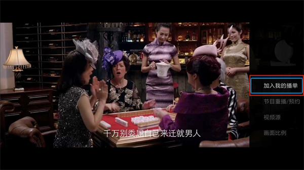 1、在任何正在播放的播单中,点击菜单键,在屏幕的右侧会弹出菜单栏,如下图所示,点击【加入我的播单】,即可将该频道加入【我的播单】列表中。