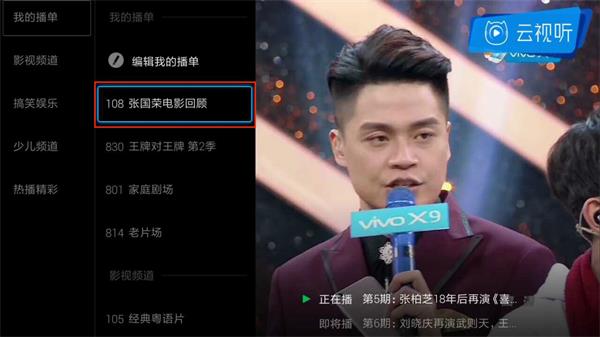 2、在备选播单页面中,点击中意的播单进行添加,已选中的播单就会出现在屏幕右侧【我的播单】中,小编喜欢看张国荣的电影,这里就以“张国荣电影回顾”播单为例;