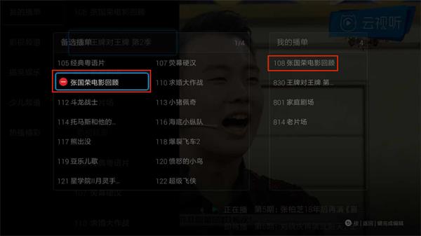 2、在备选播单页面中,点击中意的播单进行添加,已选中的播单就会出现在屏幕右侧【我的播单】中,小编喜欢看张国荣的电影,这里就以“张国荣电影回顾”播单为例;