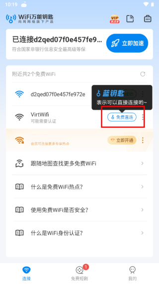 1、在本站下载安装WiFi万能钥匙app进入,打开手机WiFi功能,即可自动搜索附近WiFi,有蓝钥匙表示可以直接连接,点击蓝钥匙;