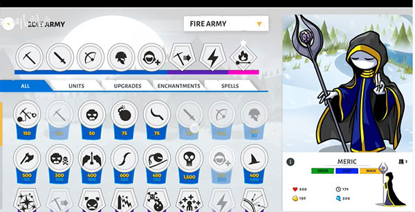 第七关:解放皮特大陆,对面是剑士和弓箭手的组合,八个矿工全力发展经济,先养两排剑士,后期可以开始养巫师(可以试着操控剑士优先解决弓箭手)