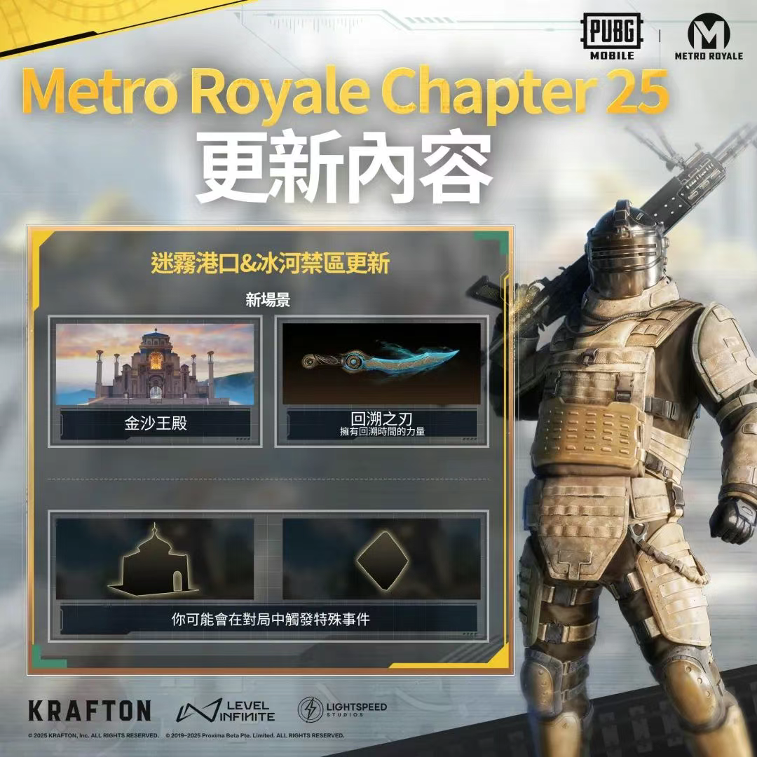 新版本更新了迷雾港口和冰河禁区两张地图,新增了金沙王殿区域和宝藏事件,玩家可以探索遗迹、寻找宝藏并开启宝库。此外,还新增了“死亡竞技-仓库”模式和JS9冲锋枪等武器,提升了游戏的玩法多样性。赛季方面,开放了Chapter 25赛季,并更新了赛季收藏品。