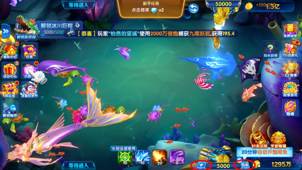 2、点击炮台两侧的+号以及自动按钮,可以调整炮台倍数以及自动发射
