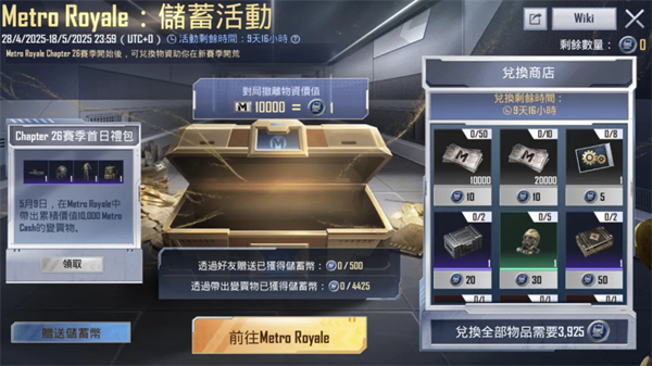 5月9日-5月18日期间,消耗之前积累的储蓄币,可在活动页面右侧的兑换商店兑换游戏道具、地铁逃生物资等奖励!
