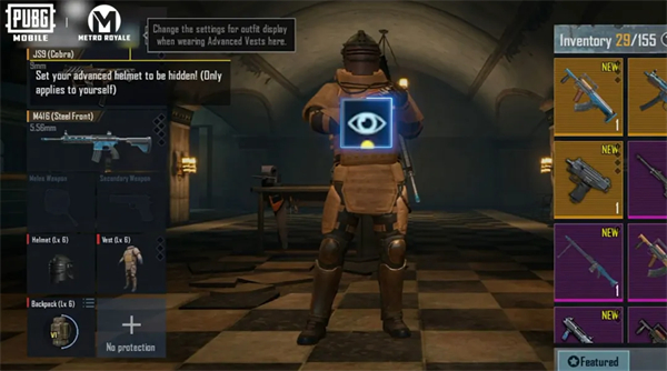 另外,以后各位特种兵想显示或隐藏头盔和背囊的模型外观时,可直接在Metro Royale大厅打开战备功能,点击左上角的小眼睛按钮来调整设定。无需再切换回到经典大厅,操作更便捷!
