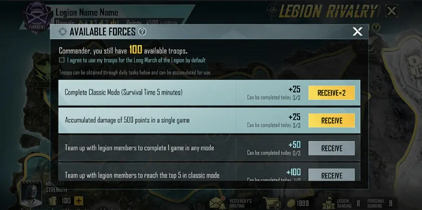 公会成员透过完成公会大战的每日任务,可以获得兵力。另外,在每日任务中,可以查看目前拥有的兵力,成员可自行使用或交由公会统一调配,用于争夺领地据点。
