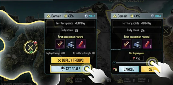 进入兵力部署视窗,点击设定目标领地和兵力值,引导成员投放兵力!