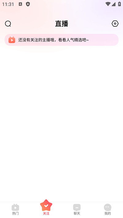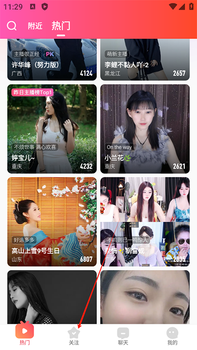1、下载六间房秀场官方版后,打开软件,登录之后点击屏幕下方的“关注”