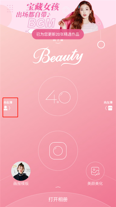 美颜磨皮、贴纸相框、彩妆滤镜,你喜爱的功能都集中一块啦:“首页上拉,进入选图修片”