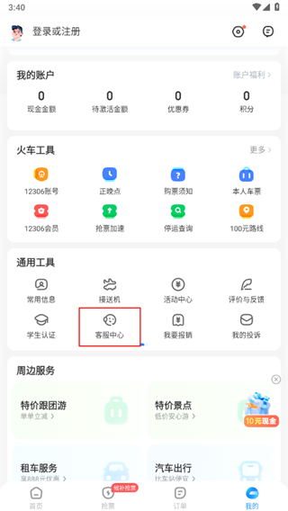 1、在打开软件之后,软件的下方有四个分类分别是首页、抢票、订单、我的,然后我们选择“我的”。然后在列表中有一个客服中心,我们选择客服中心点进去就行了。