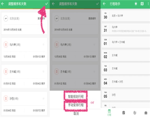第三步也是最后一步了,我们调整一下出行天数以及顺序,让它智能规划行程,当然我们也可以手动规划哦,是不是特别方便呢?
