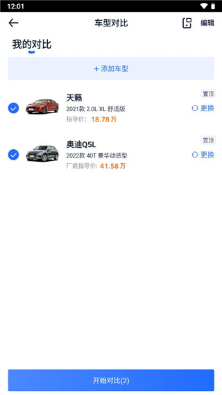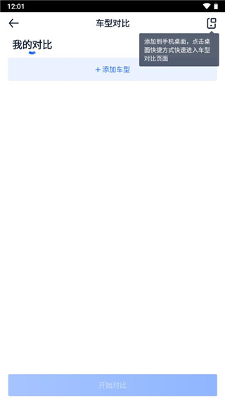 3、这样就打开了【车型对比】界面,点击下方的【添加】按钮;