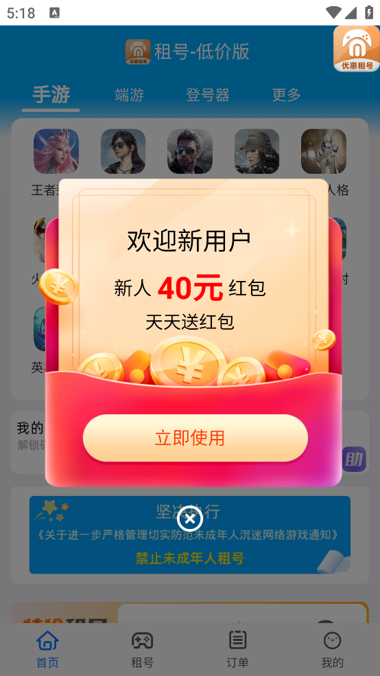 【平台直租】每日限量发放租号优惠红包
