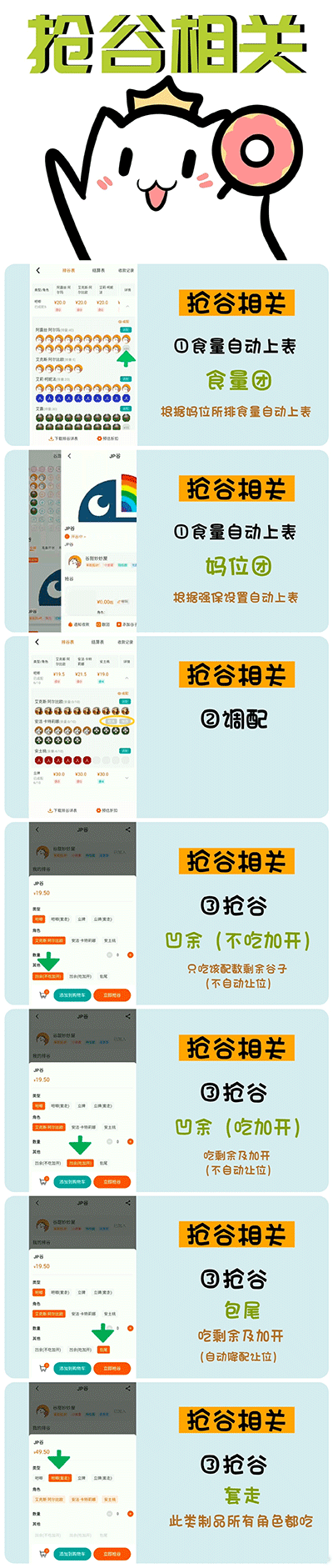 这个app还支持加入或建立谷团,管理妈位和食量,甚至可以设置不同的打野策略。用户还能发布谷子,定时开谷并自动应用策略,或者使用人偶代排功能帮不方便入群的玩家解决问题。此外,它还提供自动打表服务,支持多种算法,并能导出排表。