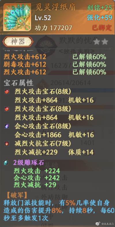 上图为武当的神器,搭配方式就略有不同,双纯阳+单命中+单会心,兼顾了属性和命中会心的提升,舍弃了减抗。这种搭配方式推荐一些号较小的平民玩家或者微氪玩家,不打架的情况下,可以暂时性舍弃掉减抗宝石,选择性价比更高的命中会心。