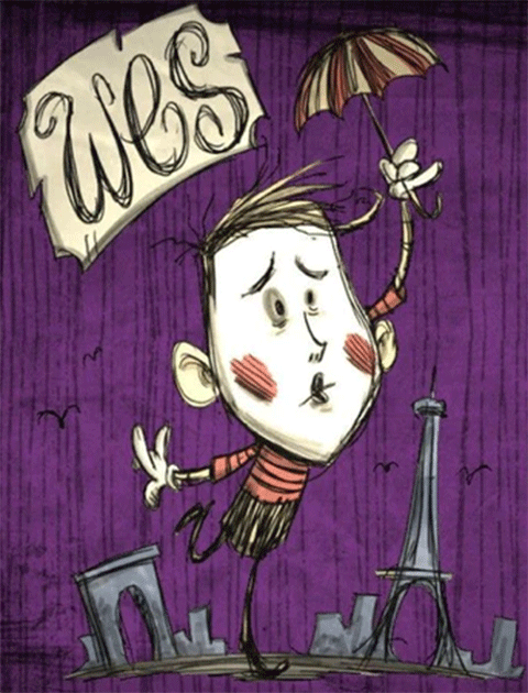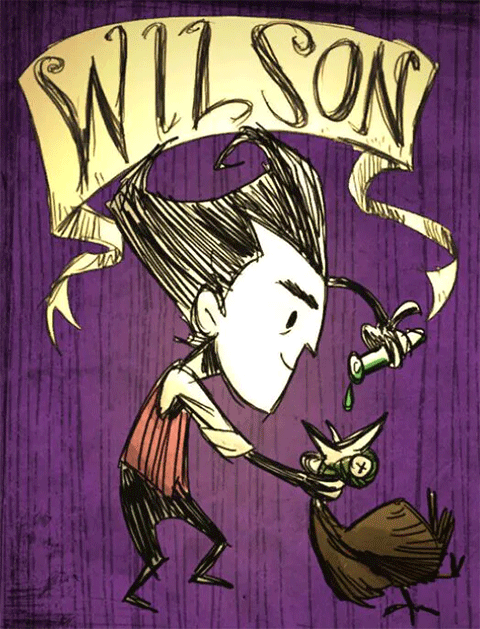 威尔逊是玩家可以使用的第一个初始角色,官方设定是科学家,被恶魔传送到异世界使用的传送门,其实也是威尔逊在恶魔的指导下完成的。威尔逊的胡子会越长越长,而胡子除了冬季的保暖作用以外,还可以剃下来作为复活肉像的主要材料之一,同时剃完胡子后也会回复 SAN 值,算是比较实用了。