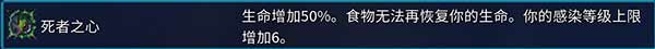 死灵法术和死者之心非常直观,一个用于回血,一个直接增加血量上限。因为这套build玩法很苟,所以大幅掉血的可能性比较小,死灵法术的回血和血瓶即可保证血线健康,血量上限的性价比要优于食物带来的恢复。