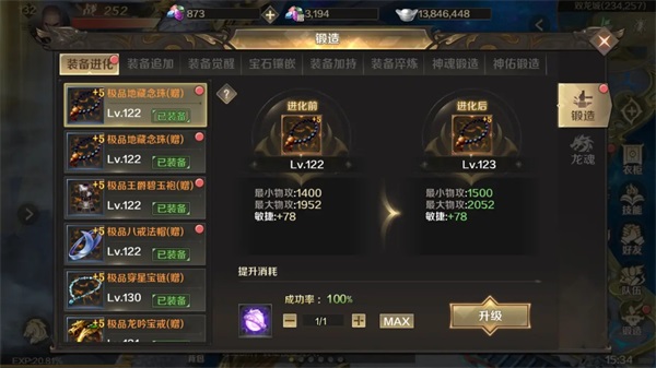 在左侧装备栏选择要进化的装备,再选取装备进化的材料(低等级装备进化需消耗流星,高等级装备进化需消耗龙珠)。所选取的副物品数量影响升级的成功率,升级栏里会根据你所选择的副物品数量显示提升的成率。