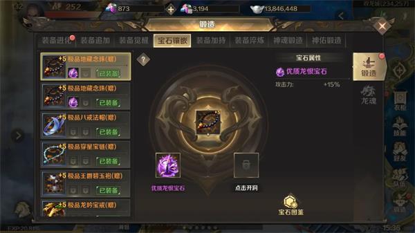 通过“锻造”按钮的“宝石镶嵌”界面来进行装备开洞和宝石镶嵌。品质越高的宝石所附加的属性值也越高。