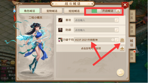 设置自己的专属战斗喊话,战斗打怪组队会更有趣哟。先开启喊话>点击+号添加技能>输入专属喊话文字以及表情包代码>点击右边符号保存喊话内容。