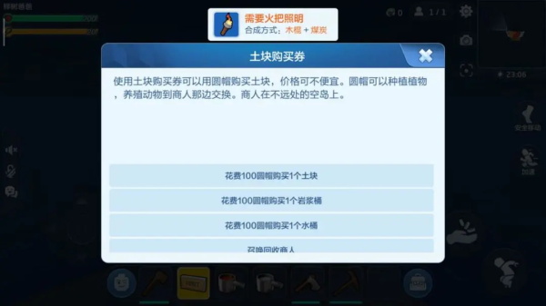那么,圆帽有什么用呢?通过系统赠送的“购买券”,可以兑换“土块”、“岩浆桶”、“水桶”,而这些都是大伙生存和发展必备的资源。