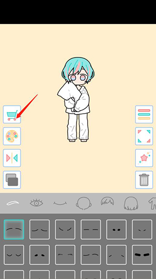 4、然后我们来到下方界面,然后点击我们之前保存的搭配即可将小人放到屏幕上,长按可拖动角色,往下滑至垃圾桶按钮可删除角色,返回搭配界面的话同样是点击右方第三个按钮。