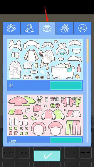 3、然后我们点击右方第三个按钮(下方箭头指向位置,点击前千万要记得保存服饰搭配,不然会清空搭配数据),然后点击勾号;