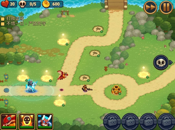 玩这款游戏需要注意右上角的三个图标,第一个爱心代表敌人可以通过这段路到达最后的个数,第二个代表敌人的拨数,2/4代表已经过了两拨, 还有两拨要来,第三个是金币,金币只能在这一局里使用,可以用来购买塔和升级。站在草坪里的英雄可以随意走动,可以用来和塔一起攻打敌人或者攻打塔无法触及的地方。