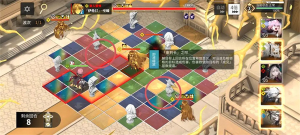 思路:队伍血量扛得住的情况下,可以把尤莱雅更换其他输出位。每4个回合掉落石雕,该回合所有敌人受到伤害+30%,零破技能建议在该回合内使用,让输出最大化。BOSS米伦·戈蒂埃攻击范围有死角,连锁终点尽量在死角处也就是日字格处结束,这样可以少吃BOSS的伤害,同时落脚点尽量靠其他小怪,对小怪造成伤害BOSS也会承受。李天闲大招尽量目标只有BOSS,避免伤害打到其他小怪反而伤害过低,库斯库塔0破尽量印记叠到5层再用大招,一破可以第二回合再使用,伤害最大化。