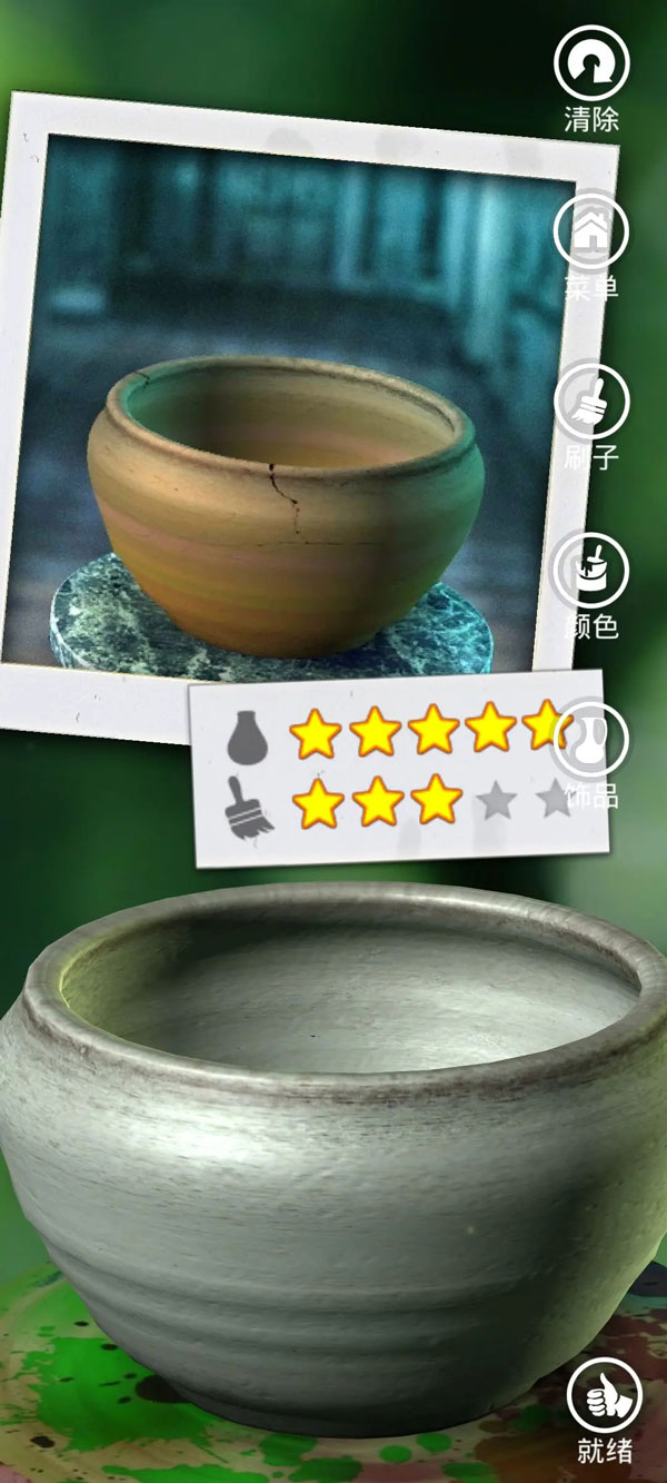 6、游戏的操作是触屏操作,能通过重力感应查看不同角度的陶瓷,玩家靠自己的创造力捏出不同风格形状的陶瓷,游戏简单而有趣,非常容易就能上手。