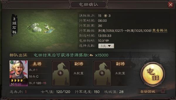 名声值过3500就开启屯田功能,屯田可以获得很多资源,每次屯田都会消耗3个策书,策书每小时会恢复1个。等主公能打3级地时,屯田功能基本已经开启,这时候主公可以优先选择屯石料,前期石料会比较缺。