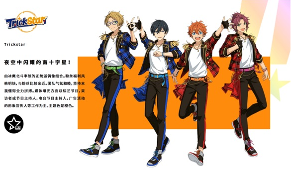 Trickstar由衣更真绪、游木真、明星昴流、冰鹰北斗四位美少年组成,他们性格各异,但是都在舞台上散发着别具一格的魅力!就让这四位美少年和你一起享受音乐演艺的生活吧!