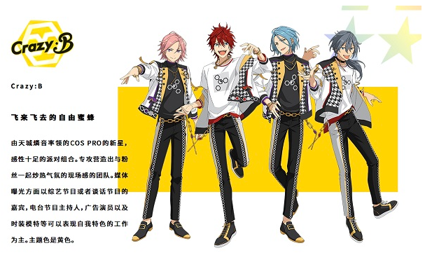 音乐组合Crazy:B隶属于事务所COSMIC PRODUCTION,是由队长天城燐音率领的感性十足的派对组合,也是事务所的新星。Crazy:B团队专攻营造出与粉丝一起炒热气氛的现场感,每一次演唱会气氛都十分热烈,掌声呐喊声如潮。相信你也会爱上他们的演唱会现场!