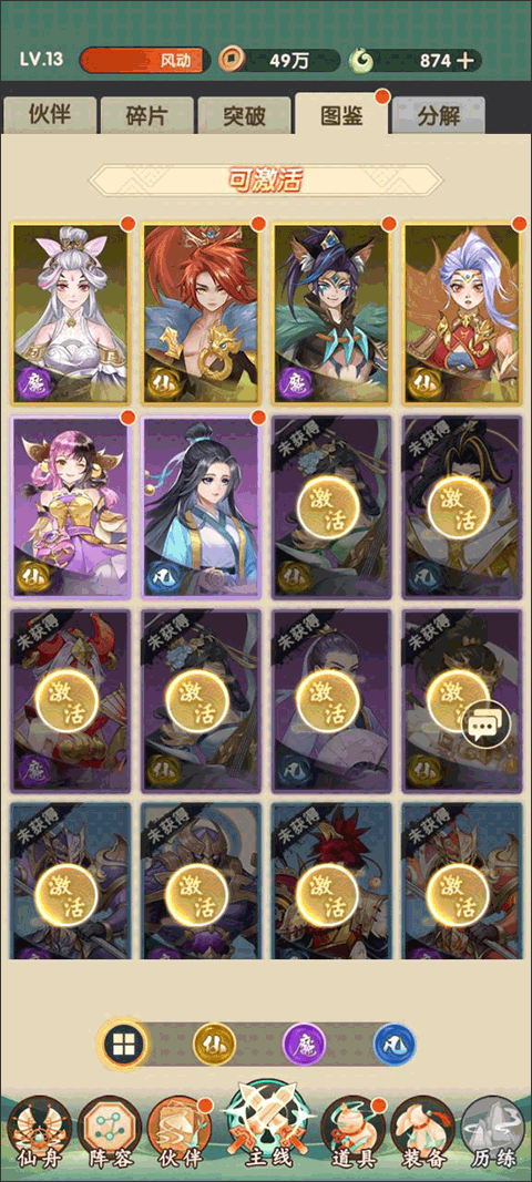 我们在伙伴的界面就可以找到图鉴的入口了,在这我们可以将我们获得的角色激活,激活后会获得一定的全队属性加成,无论激活的是什么品质的伙伴都可以提升哦,是不是棒?