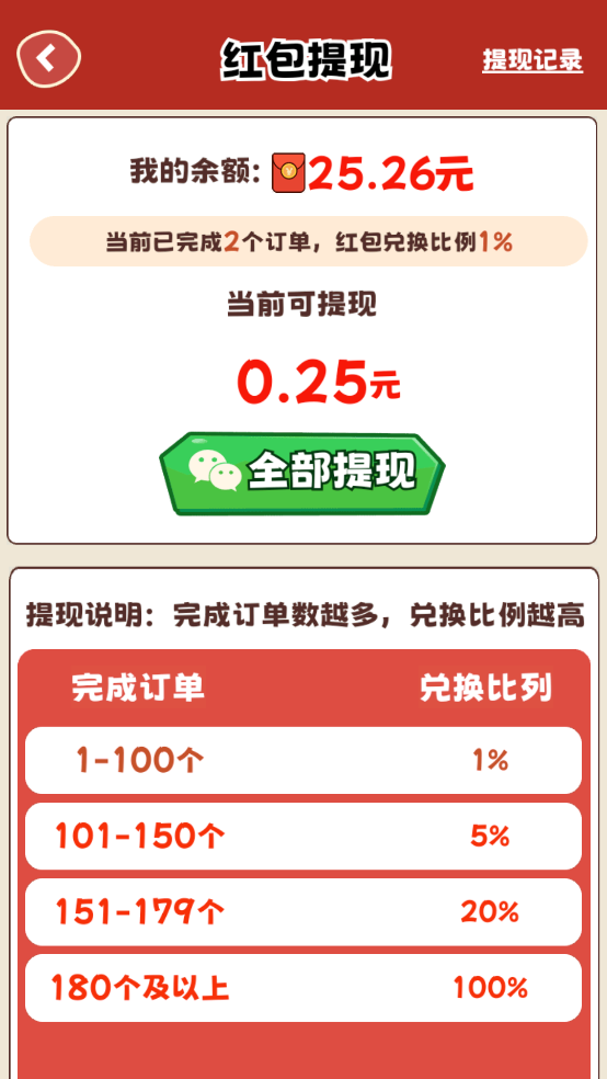 4、完成订单数越多,兑换的比例就越高,快来下载赚零花钱吧