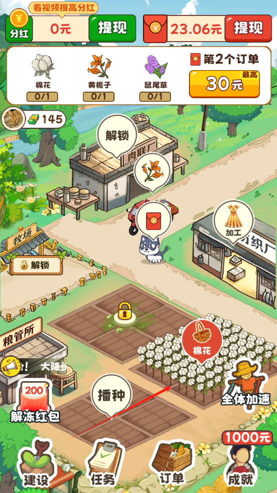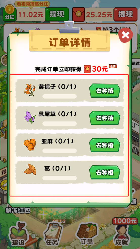 3、完成游戏内的订单也可以获得红包奖励,多要种植作物