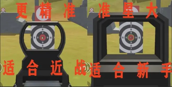红点(图1):红点开镜时候的遮挡比较小,但是准星以点呈现,更加适合近距离钢枪