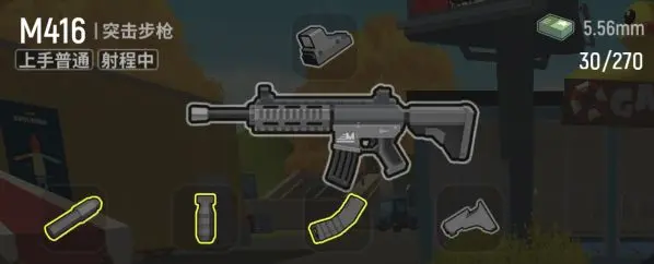 我们以满配之王M416为例,一把枪最多装备5个配件,分别为:瞄准镜,枪口,握把,弹夹和枪托。因此游戏中纵然有47个配件之多,可是细分一下还是非常一目了然的~