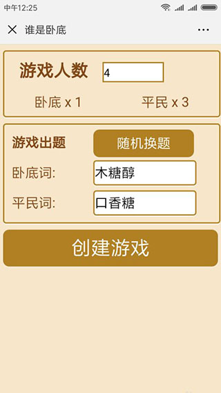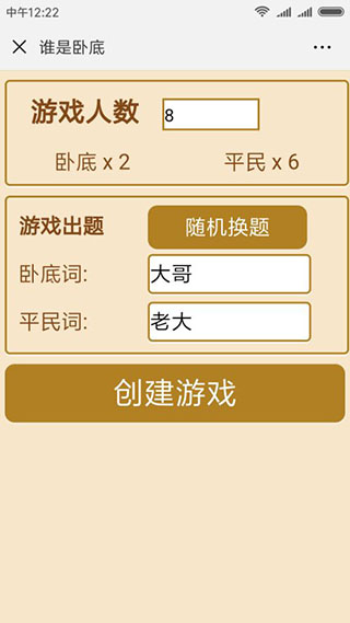 四、人员分配,如果有4个人,一个卧底,三个平民。每增加4人,就增加一名卧底。