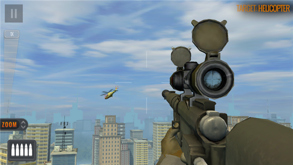 游戏中我们遵循了作为一个狙击手的原则,原地不动静待猎物出现,也就是不可移动,通过滑动屏幕来控制狙击枪的瞄准位置,拖动屏幕左边的缩放按钮来控制狙击镜的放大程度,拖到最高处狙击镜到达最大倍数。点击左下角的子弹位置来射击,当我们放大狙击镜射击的时候右上方会出现个装弹按钮,点击填充子弹,当前子弹数目在屏幕的左下角可以看到。
