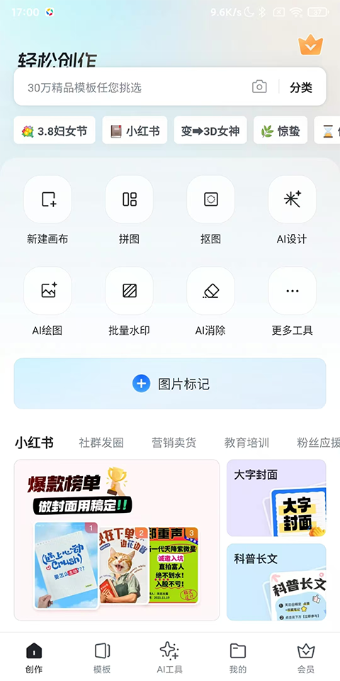 稿定设计App是一款功能强大的在线设计工具,提供多种场景和风格的模板,涵盖海报、公众号图文、小红书配图、视频、H5、PPT等,让没有PS技能的人也能轻松完成设计。它不仅适合个人用户,还能满足企业、自媒体等多种需求。App内置丰富的AI功能,比如AI文案、AI设计、AI绘图和修图,极大提升了创作效率。海量模板素材库包含20万+图片视频模板和9000万+版权素材,覆盖餐饮、教育、电商等多个行业场景。更新日志显示新版本增加了长按元素找相似和高清保存默认功能,进一步优化了用户体验。作为一个经常需要处理设计需求的人,我觉得稿定设计App确实让设计变得简单又高效,尤其是对非专业人士来说,简直是神器!
