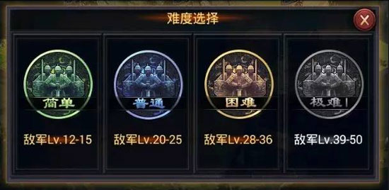 分类:自由演武分为简单、普通、困难、极难(天下大势“十八路诸侯”完成后,还会开启极难II)多种模式,随着难度的提升,奖励的资源量越大。