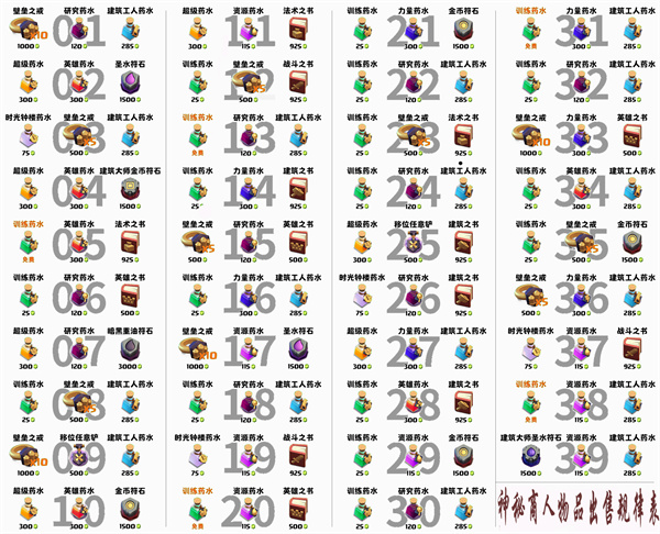 神秘商人每天都会贩卖各种魔法物品,每天上午8点准时刷新贩卖的魔法物品,每天出只会出售3种魔法物品。首领们只需要花费一定数量的宝石,就可以购买商店里的魔法物品。