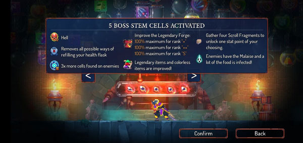 在重生细胞中,属性提升主要通过卷轴获得卷轴可以选择暴虐(红)、战术(紫)与生存(绿)的一项进行升级,分别对应近战武器、远程武器、盾牌,强化该颜色类别的武器威力和变异强度,同时获得一定的生命提升,其中绿多于红多于紫的生命提升,同种颜色的生命加成会不断衰退,但互不影响,其中红紫会在十几级时不再提供生命提升,绿色则最终趋于稳定提升(非线性)。