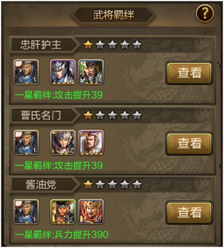 每个武将可以激活三种羁绊,每个羁绊融入三国历史中的一些典故或者渊源,同时也在游戏中会有不同的属性加成,加成的星级数受到每个武将星级的提高而提高,在羁绊列表中需要搭配的武将满足了几星的要求,就可以将羁绊点到几星。