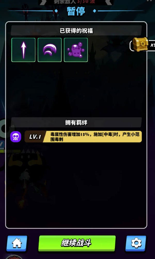 【查看已选祝福】什么?你说你打到一半不知道自己之前选了什么祝福?这个嘛..并不用担心,直接在游戏页面点击右上角暂停按钮就可以看到自己当前全部已选择的祝福和激活的羁绊啦,根据已选祝福可以更好地规划接下来的祝福选择~