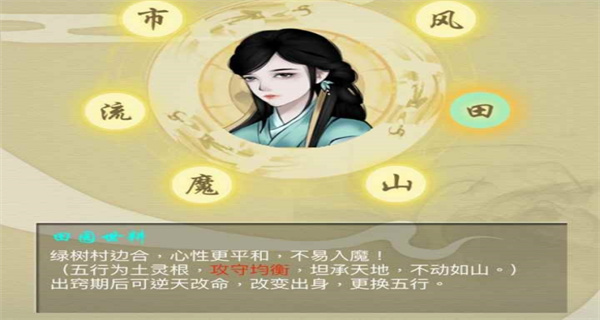【田】田园世耕,心性平和,不易入魔,五行为土灵根,攻守均衡;