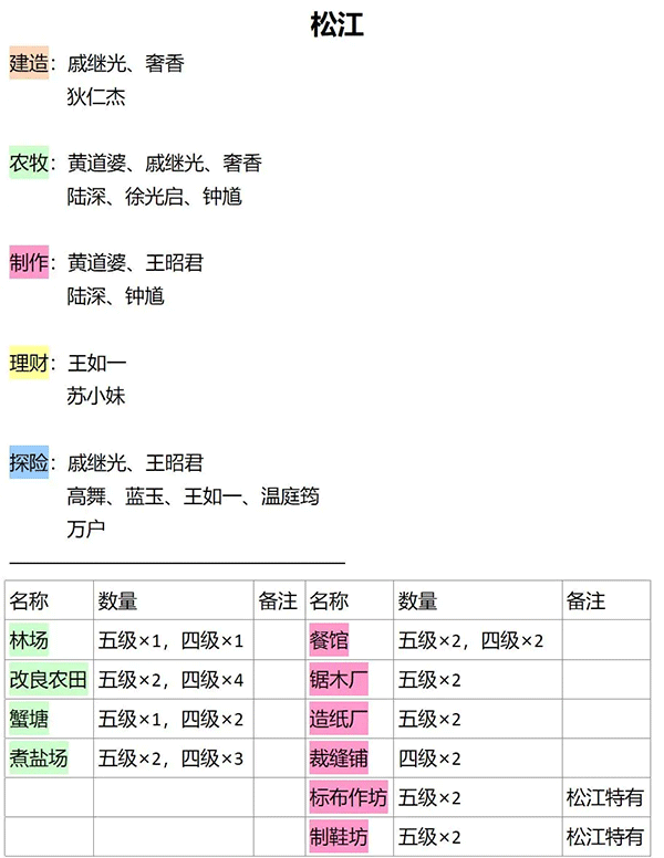 松江地方比较小,主要就是生产盐还有标布、布鞋,当鸡鸣山缺资源的时候也会生产原木还有木板。