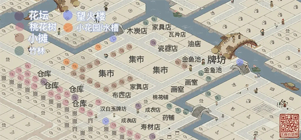 ▪仓库贴着城墙根布局,以桃花加以点缀,既离城外供应区近,又离城内需求区不远。