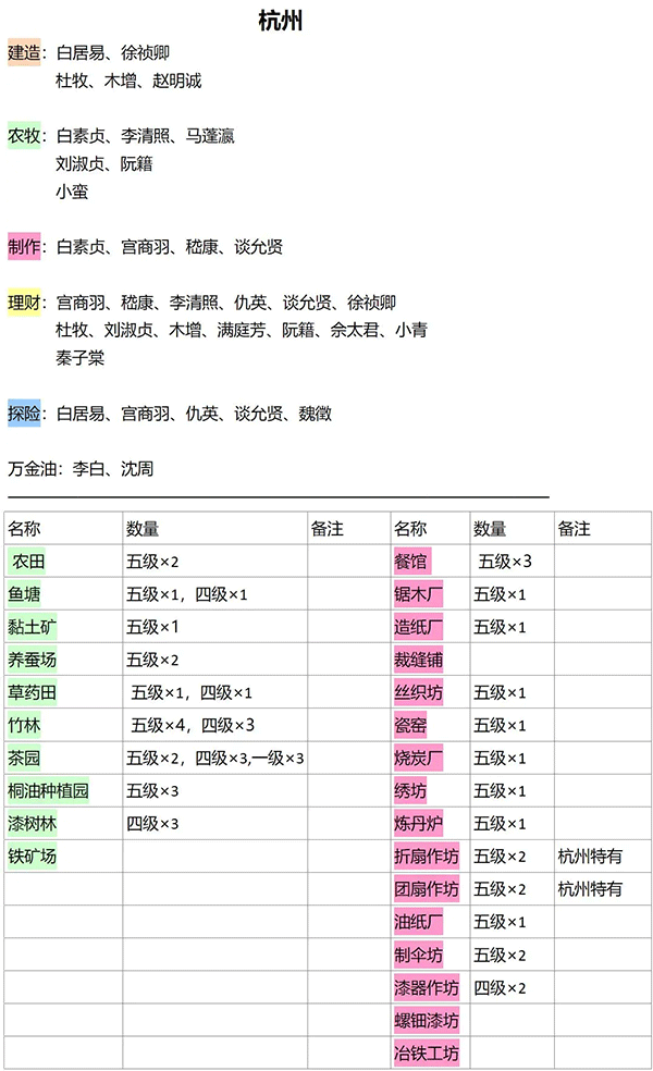 文章还详细列出了各个城市的生产资源和特色玩法,比如应天以生产为主,苏州有养蚕场和草药田,杭州则以商栈赚钱为主。此外,游戏还有城市布局建议、仓库资源统计等攻略内容,并更新了新版本的玩法和功能优化。